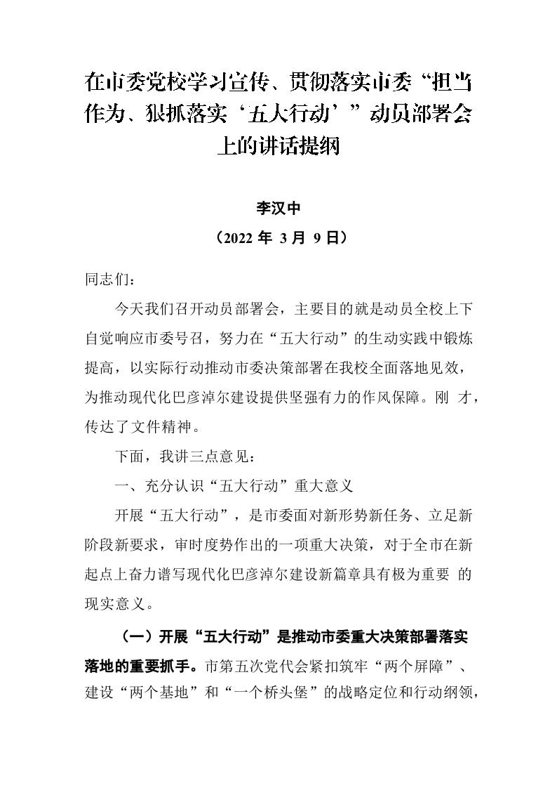 / 在市委党校学习宣传、贯彻落实市委“担当作为、狠抓落实‘五大行动’”动员部署会上的讲话提纲