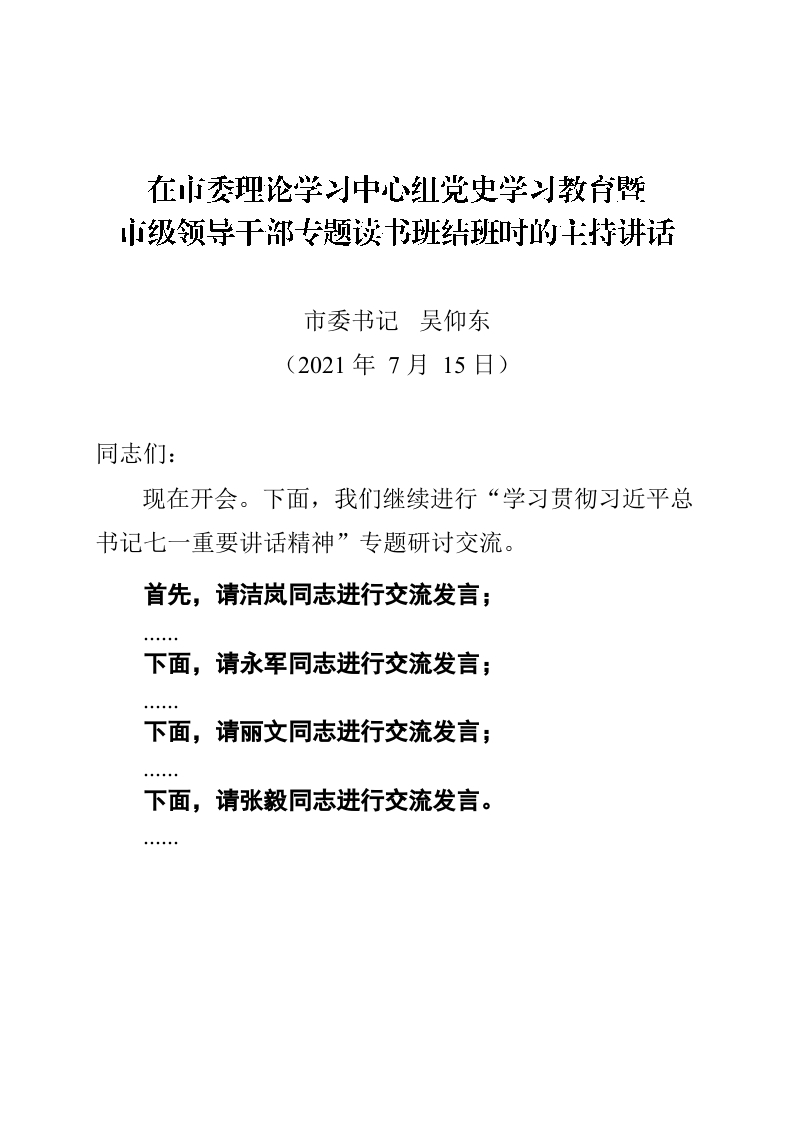 / 在市委理论学习中心组党史学习教育暨市级领导干部专题读书班结班时的主持讲话