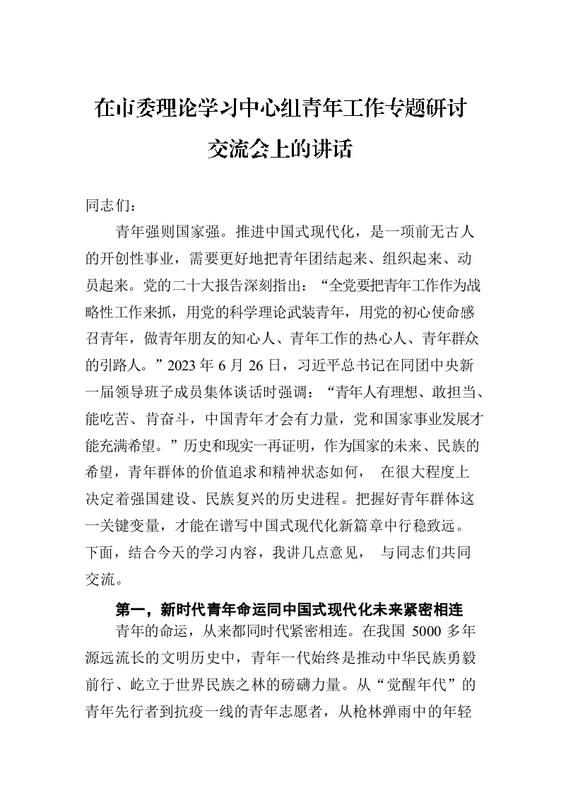 / 在市委理论学习中心组青年工作专题研讨交流会上的讲话