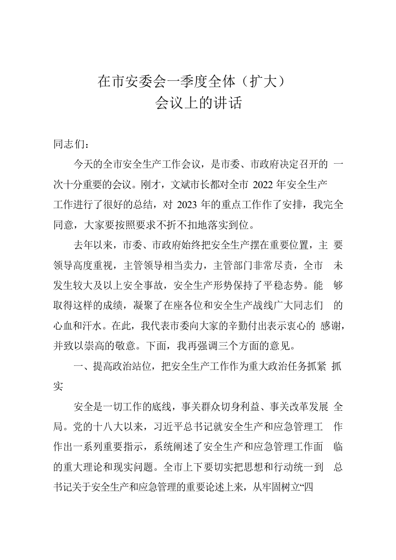 / 在市安委会一季度全体(扩大)会议上的讲话