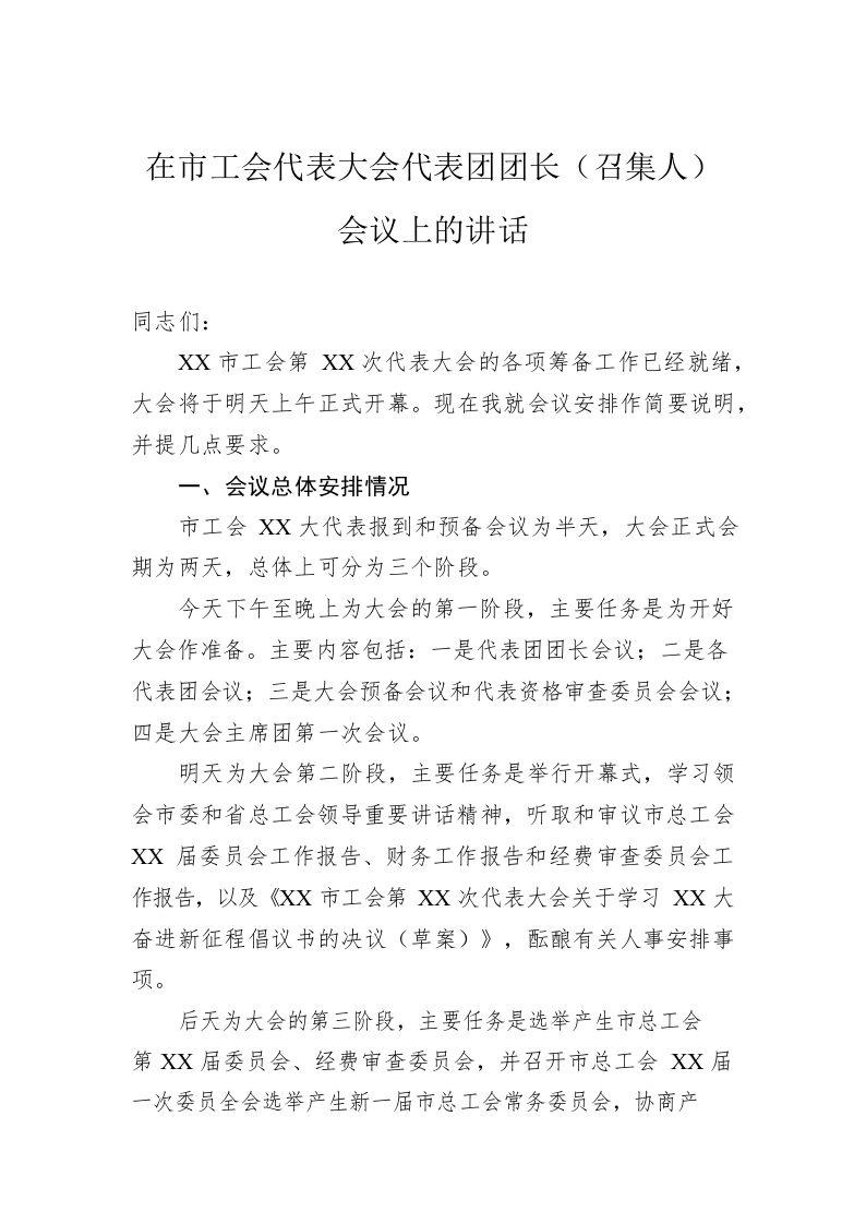 / 在市工会代表大会代表团团长(召集人)会议上的讲话