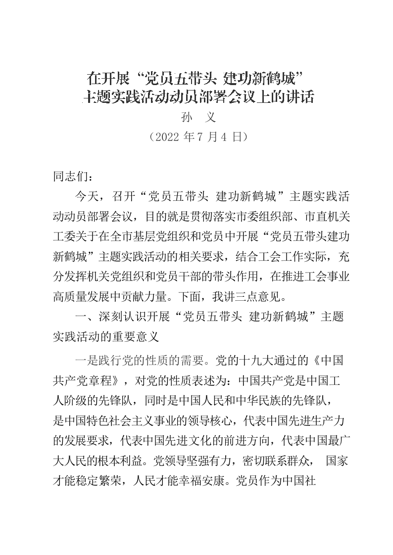 / 在市总工会“党员五带头建功新鹤城”主题实践活动动员会议上的讲话(孙义)
