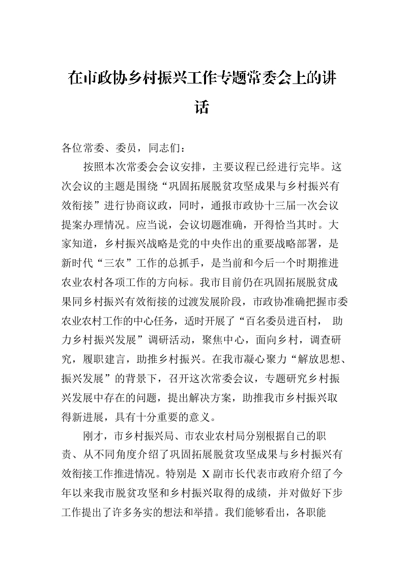 / 在市政协乡村振兴工作专题常委会上的讲话