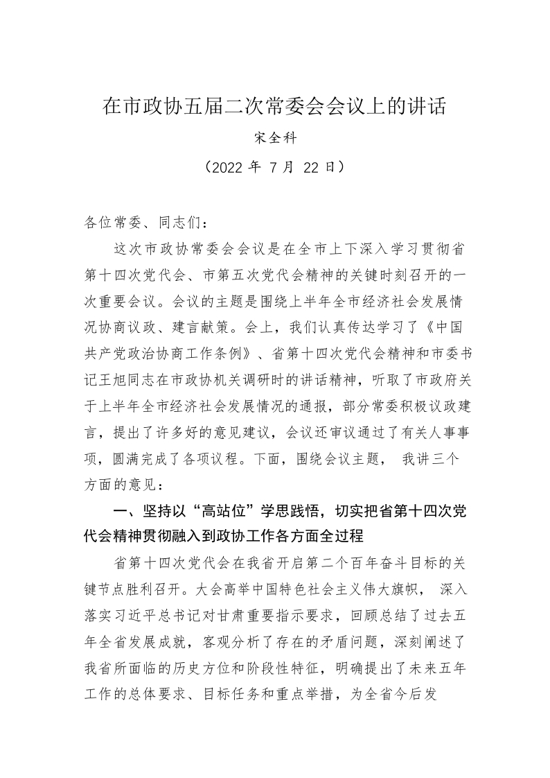 / 在市政协五届二次常委会会议上的讲话(20220722)