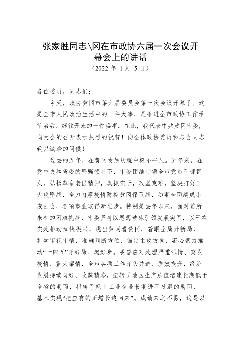 在市政协六届一次会议开幕会上的讲话(2022年1月5日)