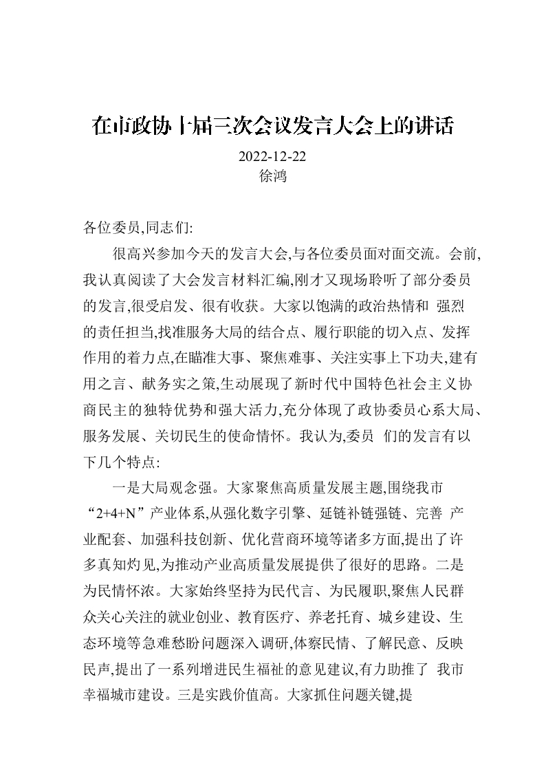 / 在市政协十届三次会议发言大会上的讲话