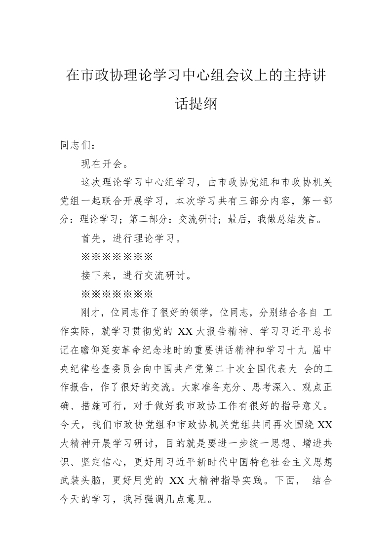/ 在市政协理论学习中心组会议上的主持讲话提纲