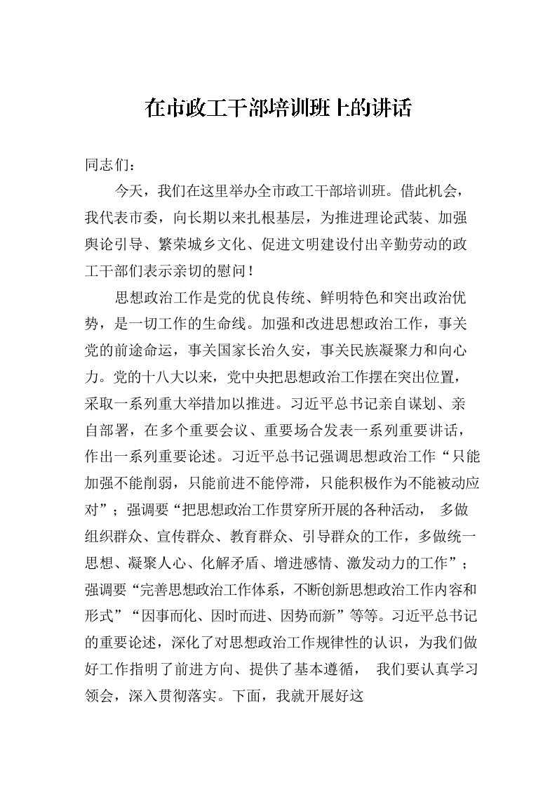 在市政工干部培训班上的讲话