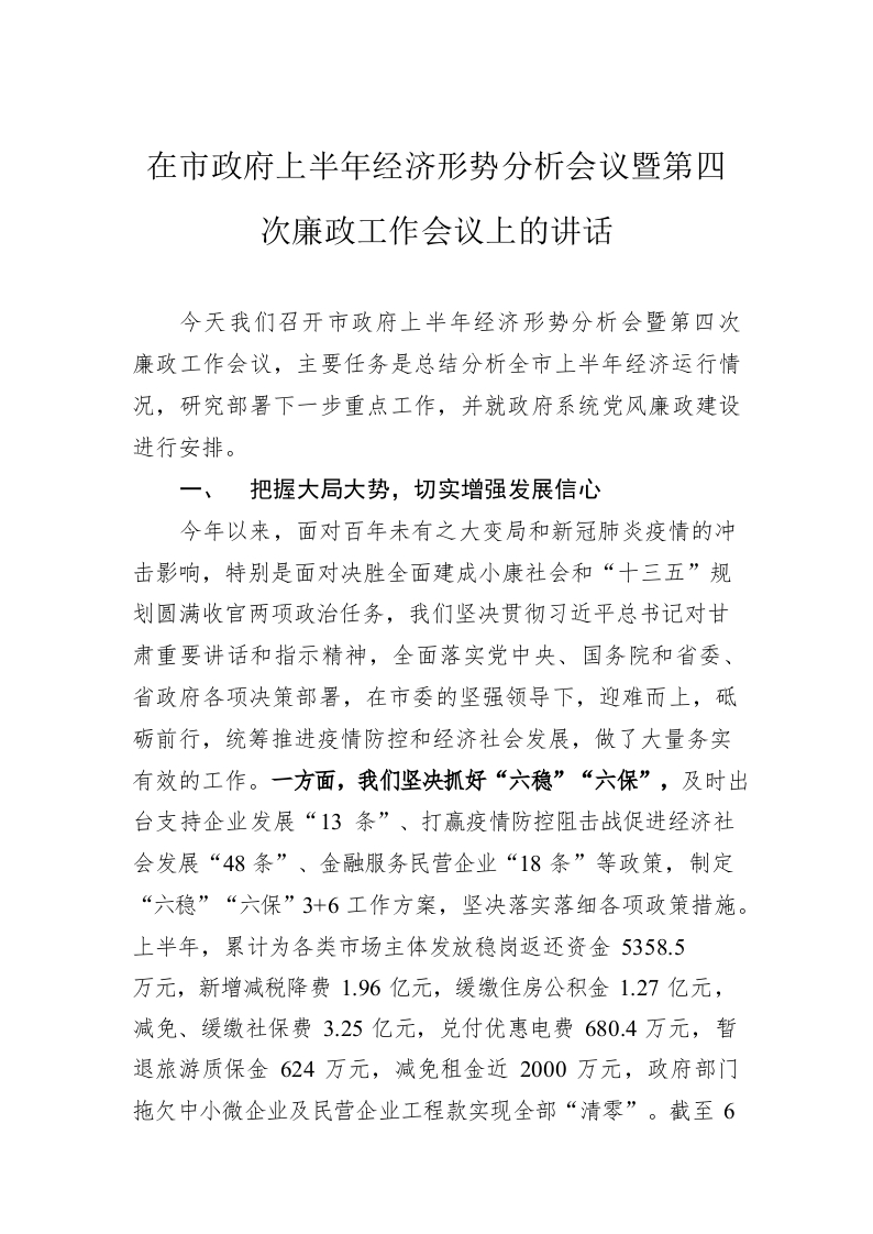 / 在市政府上半年经济形势分析会议 暨第四次廉政工作会议上的讲话