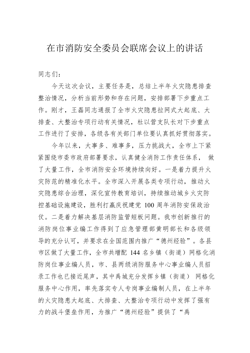 / 在市消防安全委员会联席会议上的讲话
