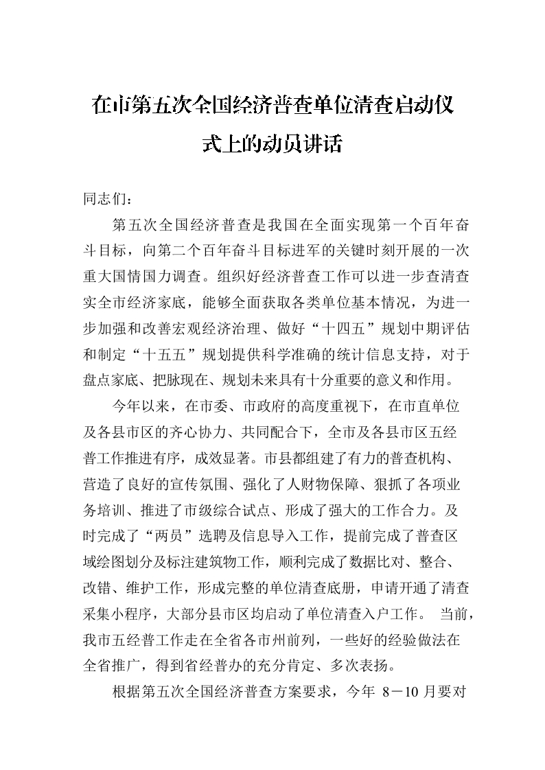 / 在市第五次全国经济普查单位清查启动仪式上的动员讲话