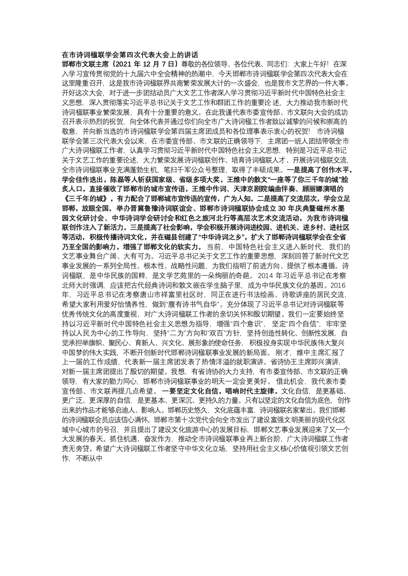 / 在市诗词楹联学会第四次代表大会上的讲话