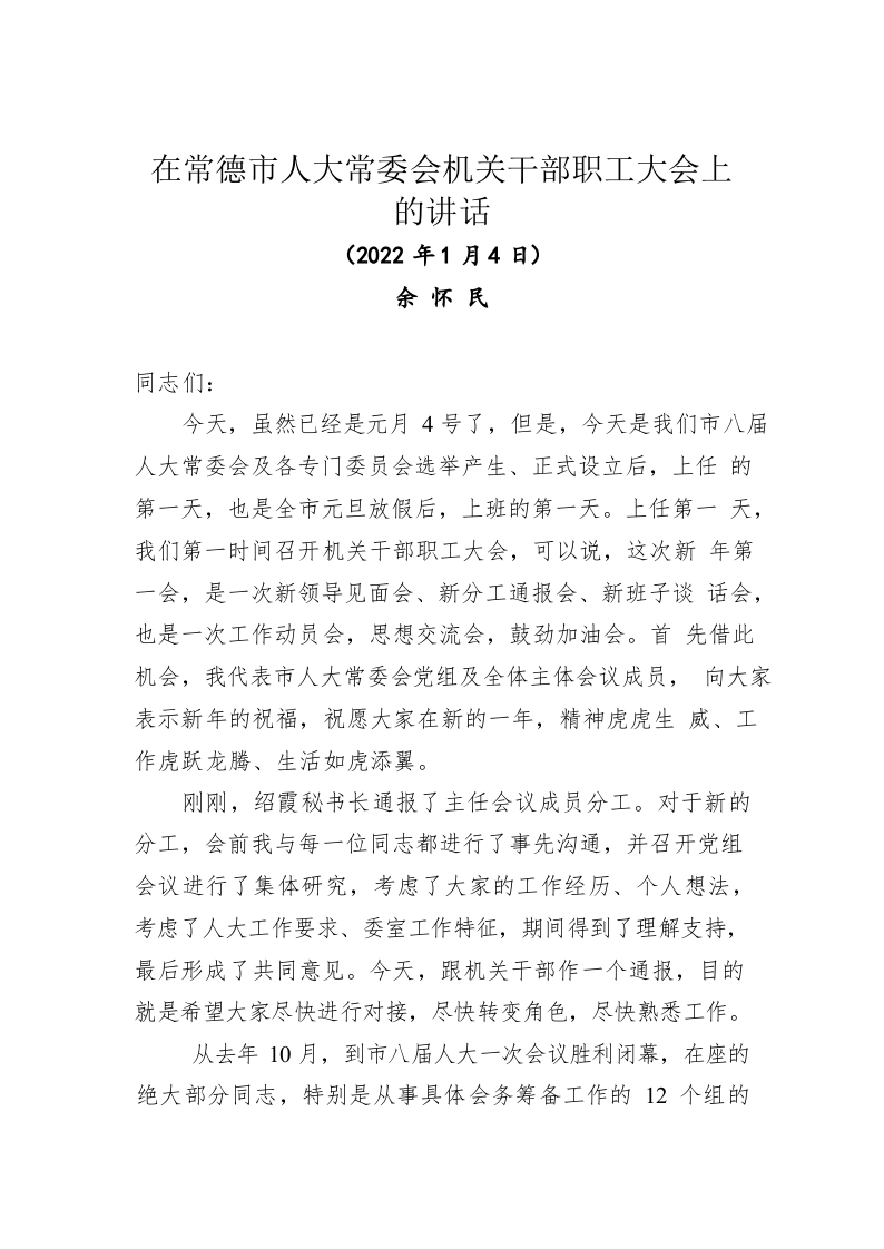 / 在常德市人大常委会机关干部职工大会上的讲话(20220104)