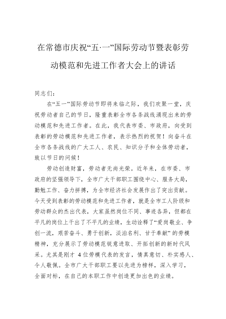 / 在常德市庆祝“五·一”国际劳动节暨表彰劳动模范和先进工作者大会上的讲话