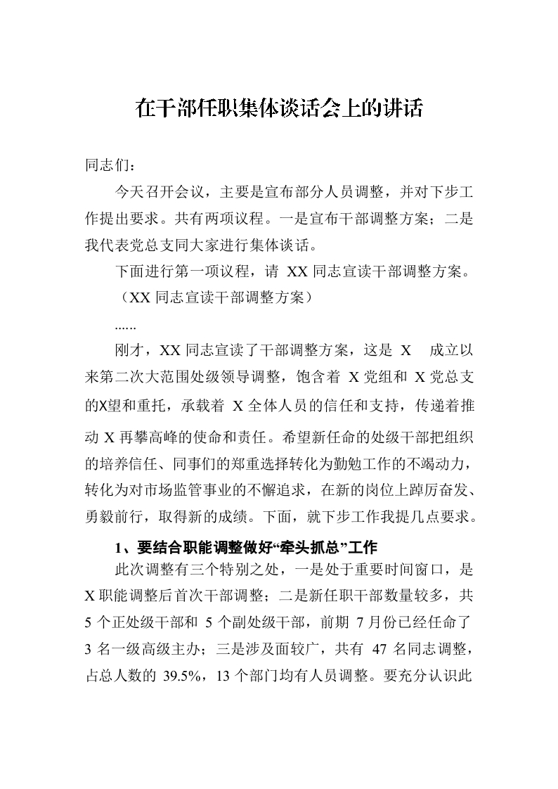 / 在干部任职集体谈话会上的讲话(宣布干部调整方案)
