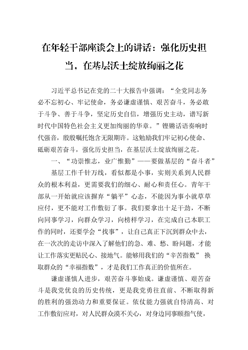 / 在年轻干部座谈会上的讲话:强化历史担当,在基层沃土绽放绚丽之花