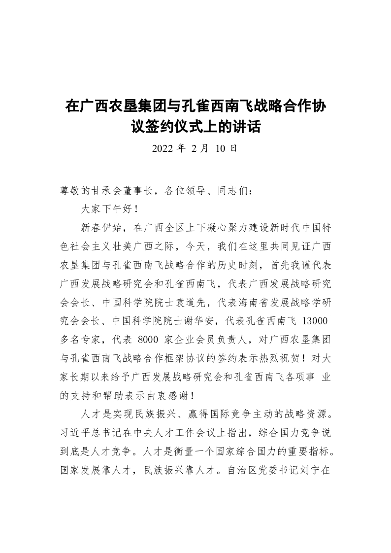 / 在广西农垦集团与孔雀西南飞战略合作协议签约仪式上的讲话(20220210)