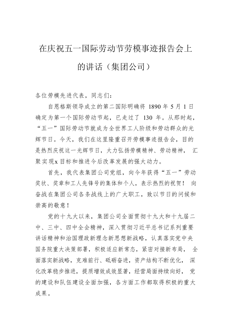 / 在庆祝五一国际劳动节劳模事迹报告会上的讲话(集团公司)