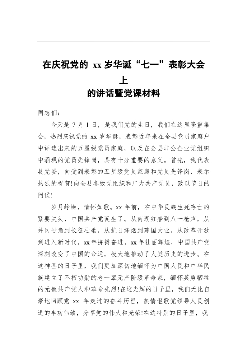 在庆祝党的xx岁华诞“七一”表彰大会上的讲话暨党课材料