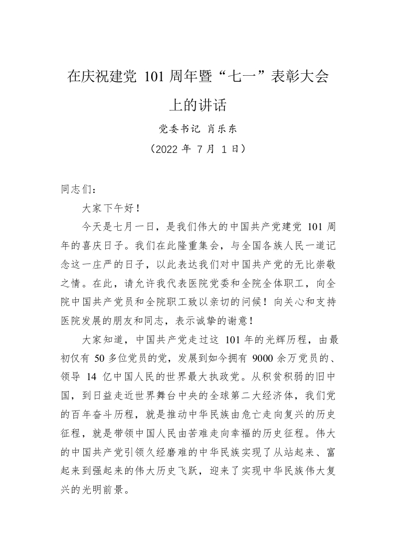 在庆祝建党101周年暨“七一”表彰大会上的讲话(20220701)