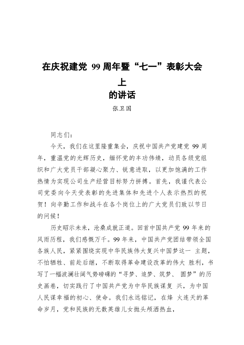 在庆祝建党99周年暨“七一”表彰大会上的讲话