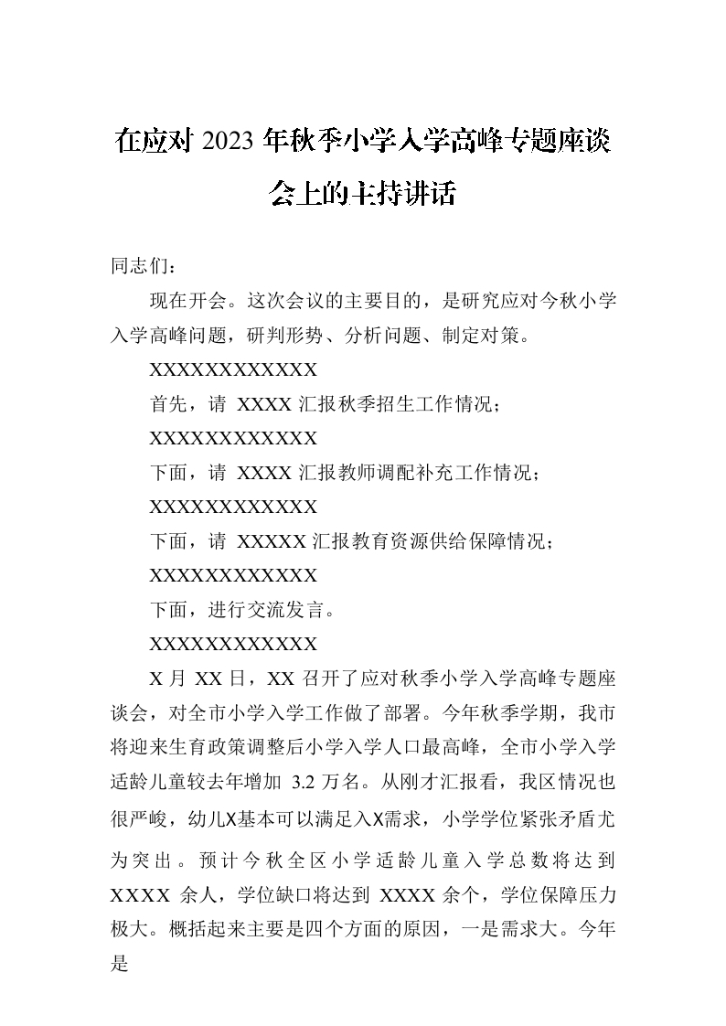 / 在应对2023年秋季小学入学高峰专题座谈会上的主持讲话