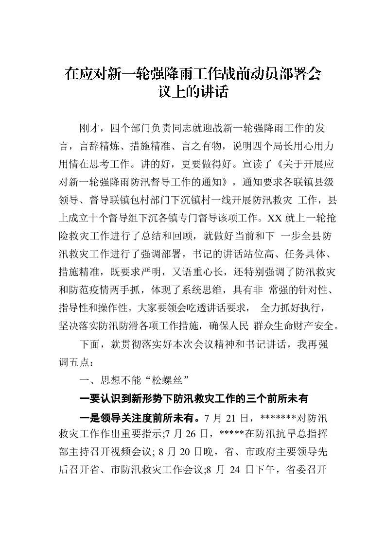 / 在应对新一轮强降雨工作战前动员部署会议上的讲话