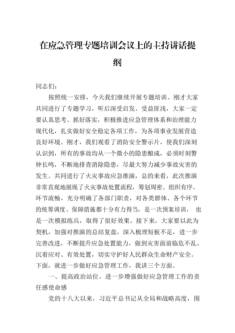 / 在应急管理专题培训会议上的主持讲话提纲