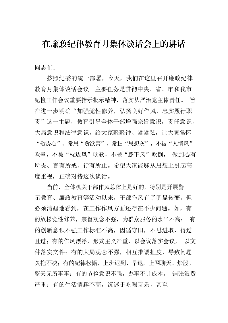 / 在廉政纪律教育月集体谈话会上的讲话