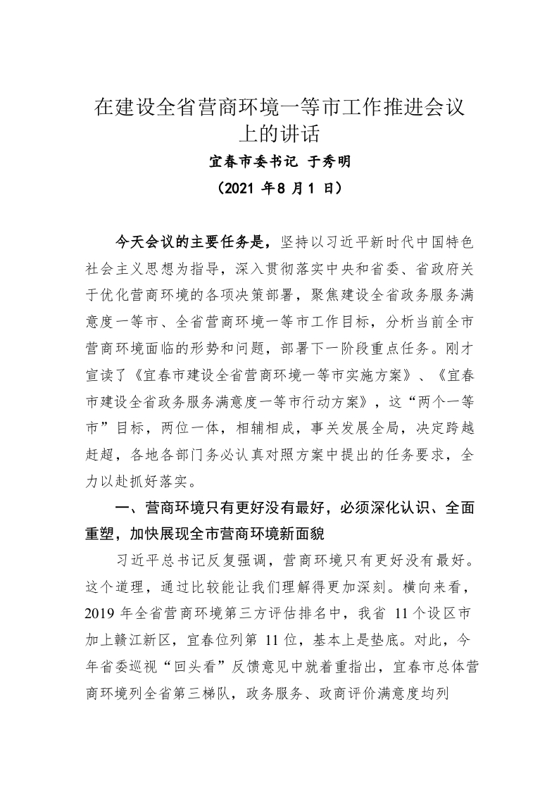 / 在建设全省营商环境一等市工作推进会议上的讲话(202108)