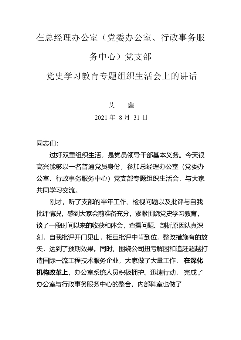 在总经理办公室(党委办公室、行政事务服务中心)党支部党史学习教育专题组织生活会上的讲话