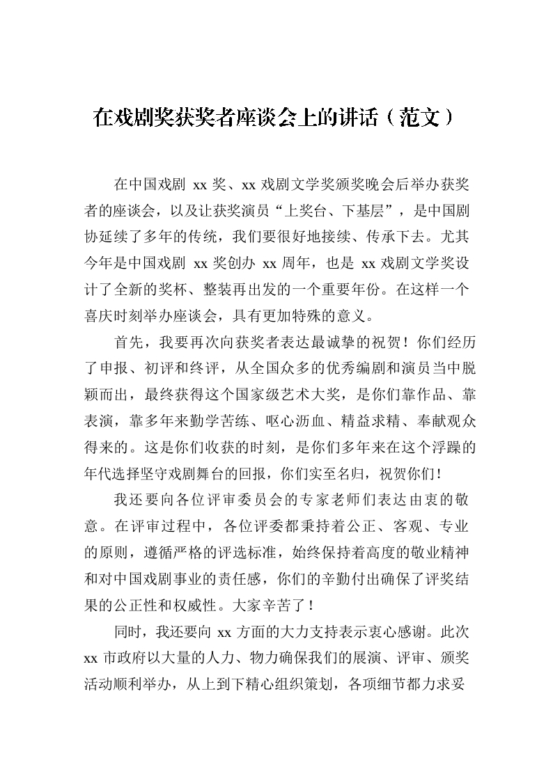 / 在戏剧奖获奖者座谈会上的讲话(范文)