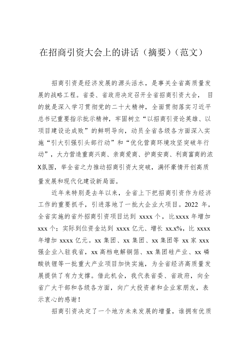 / 在招商引资大会上的讲话(摘要)(范文)
