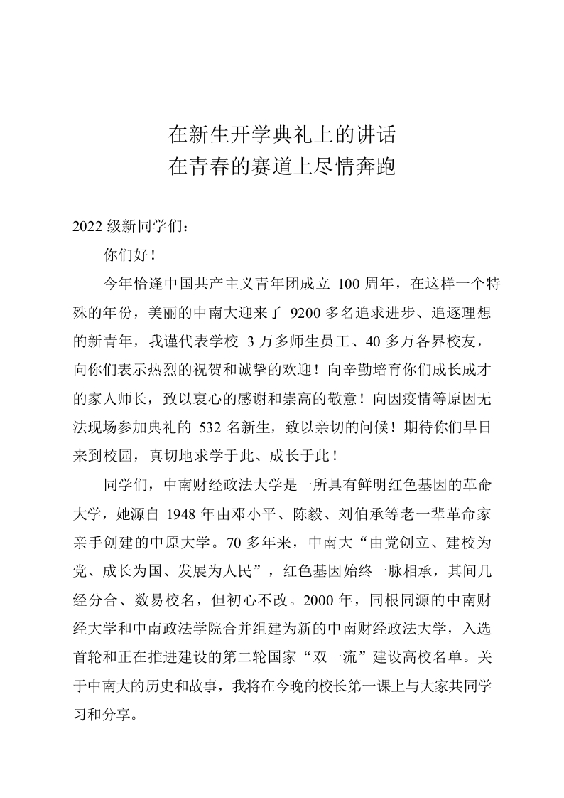 / 在新生开学典礼上的讲话 在青春的赛道上尽情奔跑