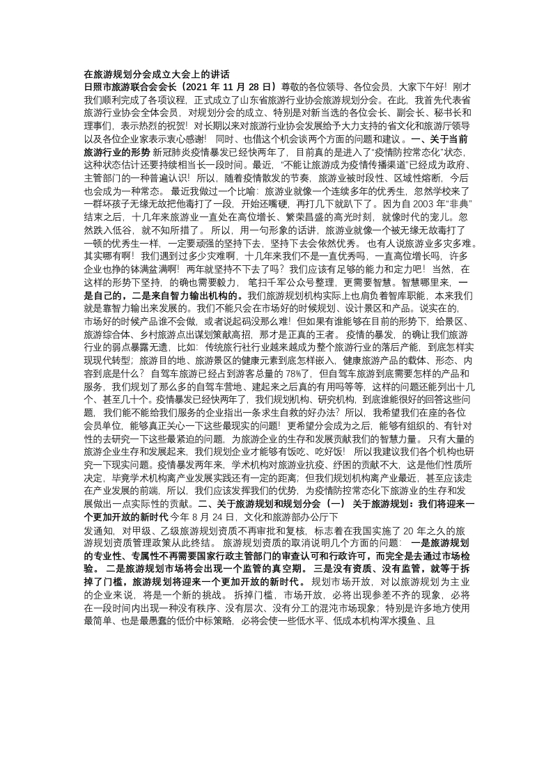 / 在旅游规划分会成立大会上的讲话