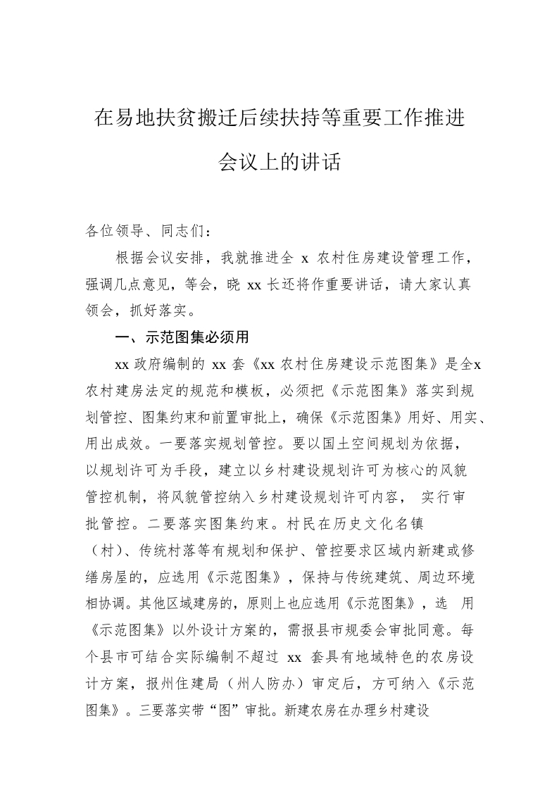 / 在易地扶贫搬迁后续扶持等重要工作推进会议上的讲话