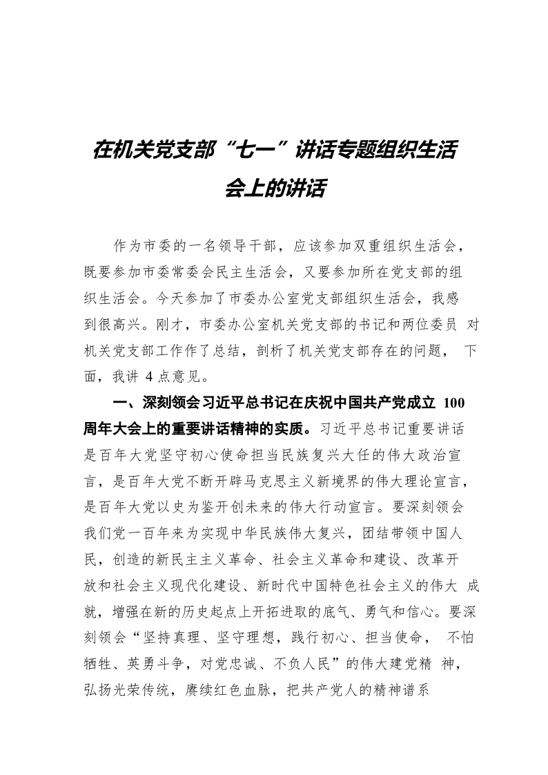 / 在机关党支部“七一”讲话专题组织生活会上的讲话