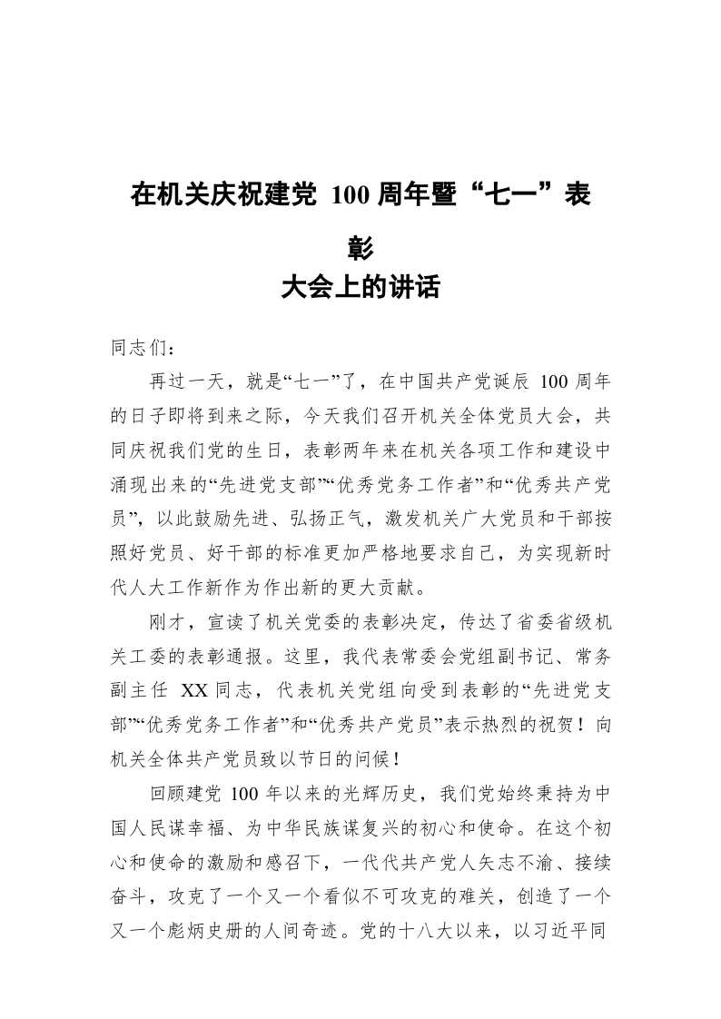 在机关庆祝建党100周年暨“七一”表彰大会上的讲话稿