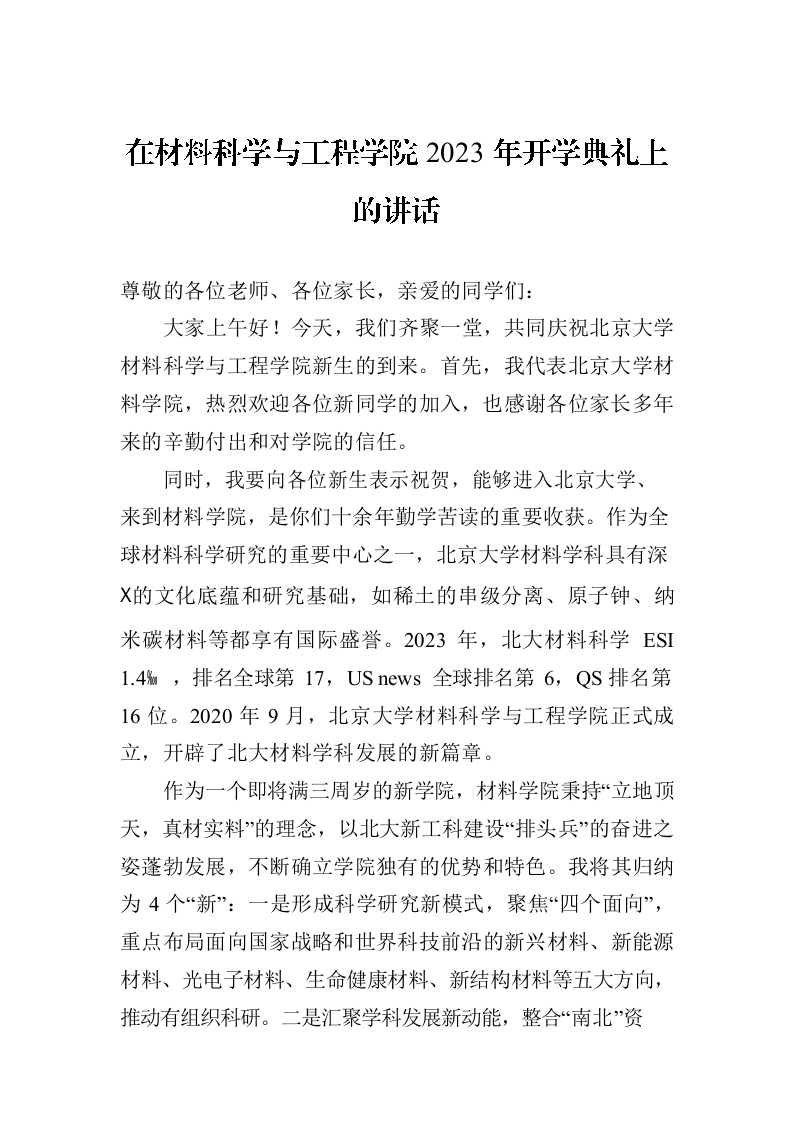 / 在材料科学与工程学院2023年开学典礼上的讲话(20230905)