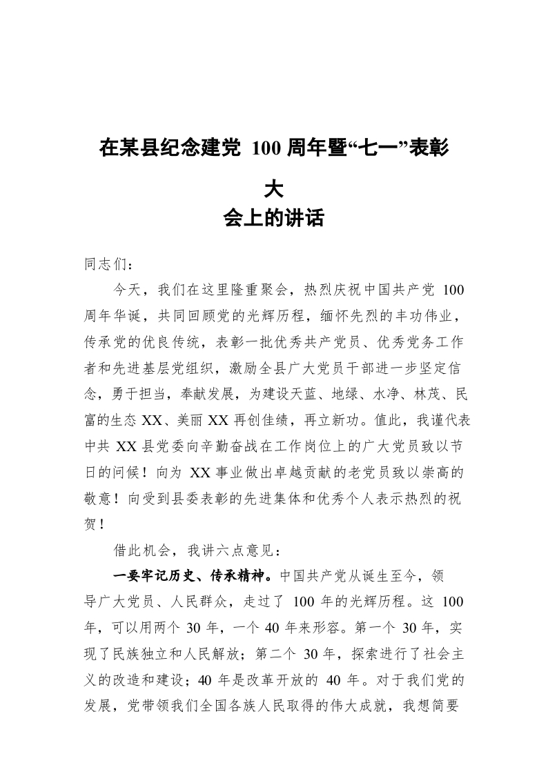 / 在某县纪念建党100周年暨“七一”表彰大会上的讲话
