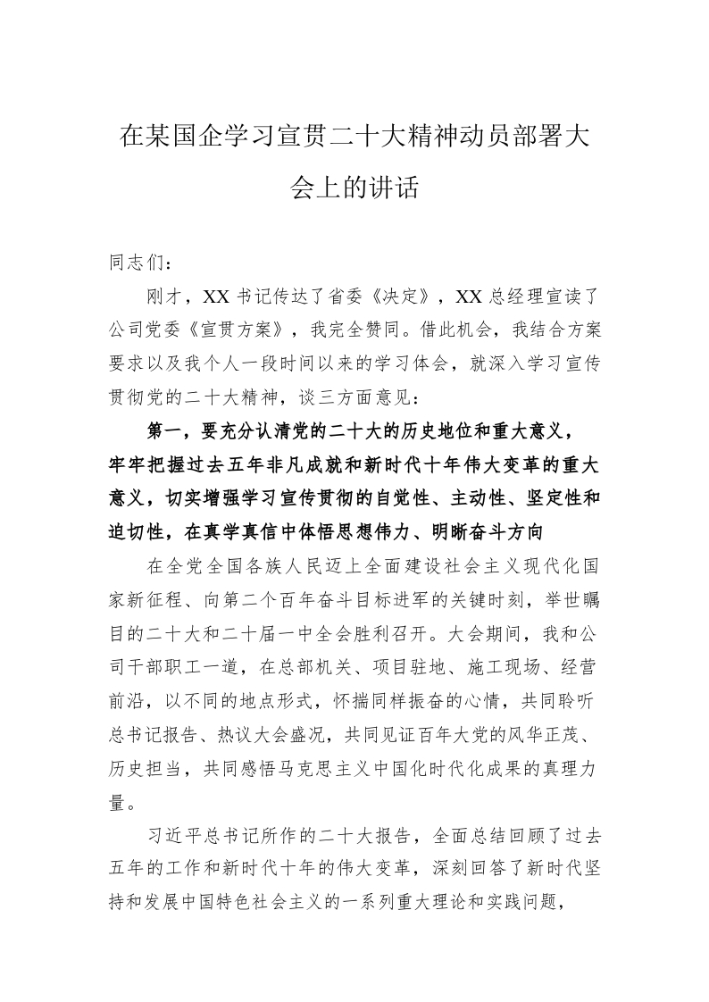 / 在某国企学习宣贯二十大精神动员部署大会上的讲话