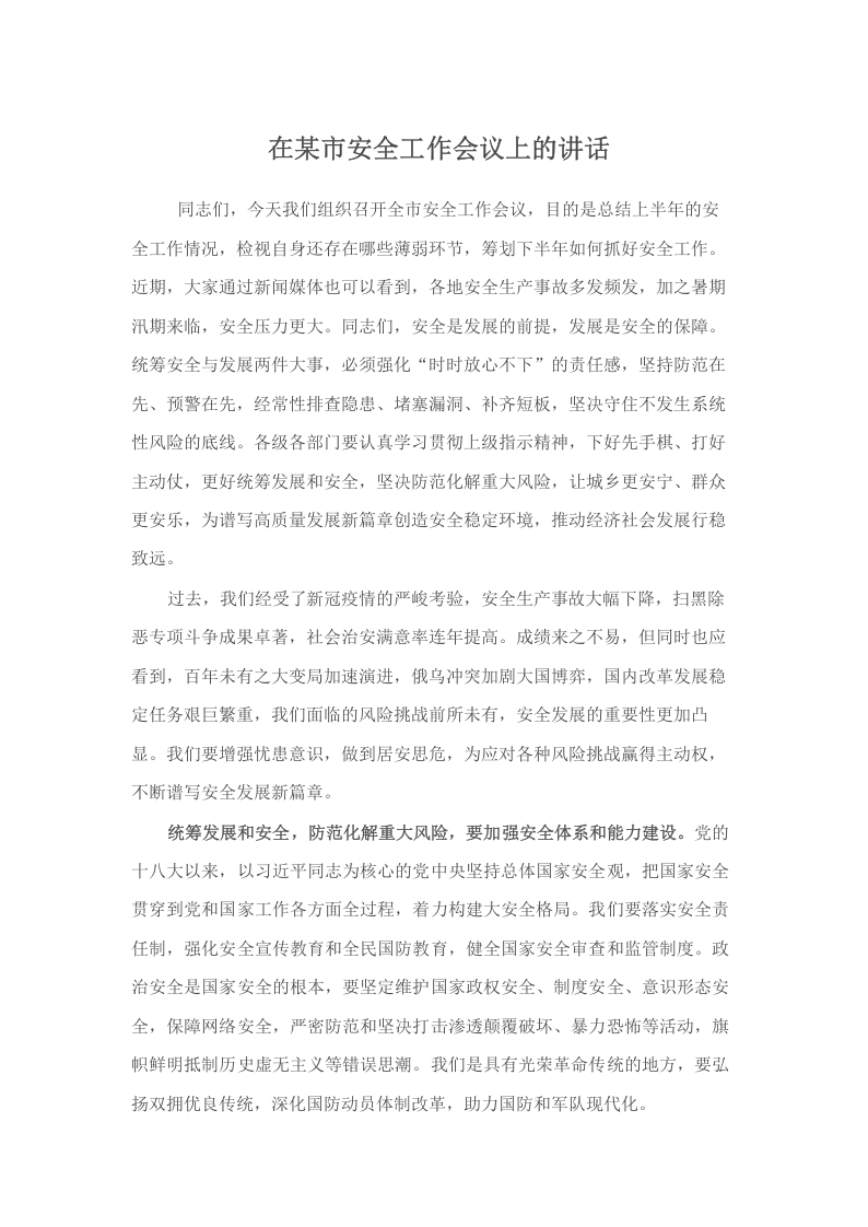 / 在某市安全工作会议上的讲话