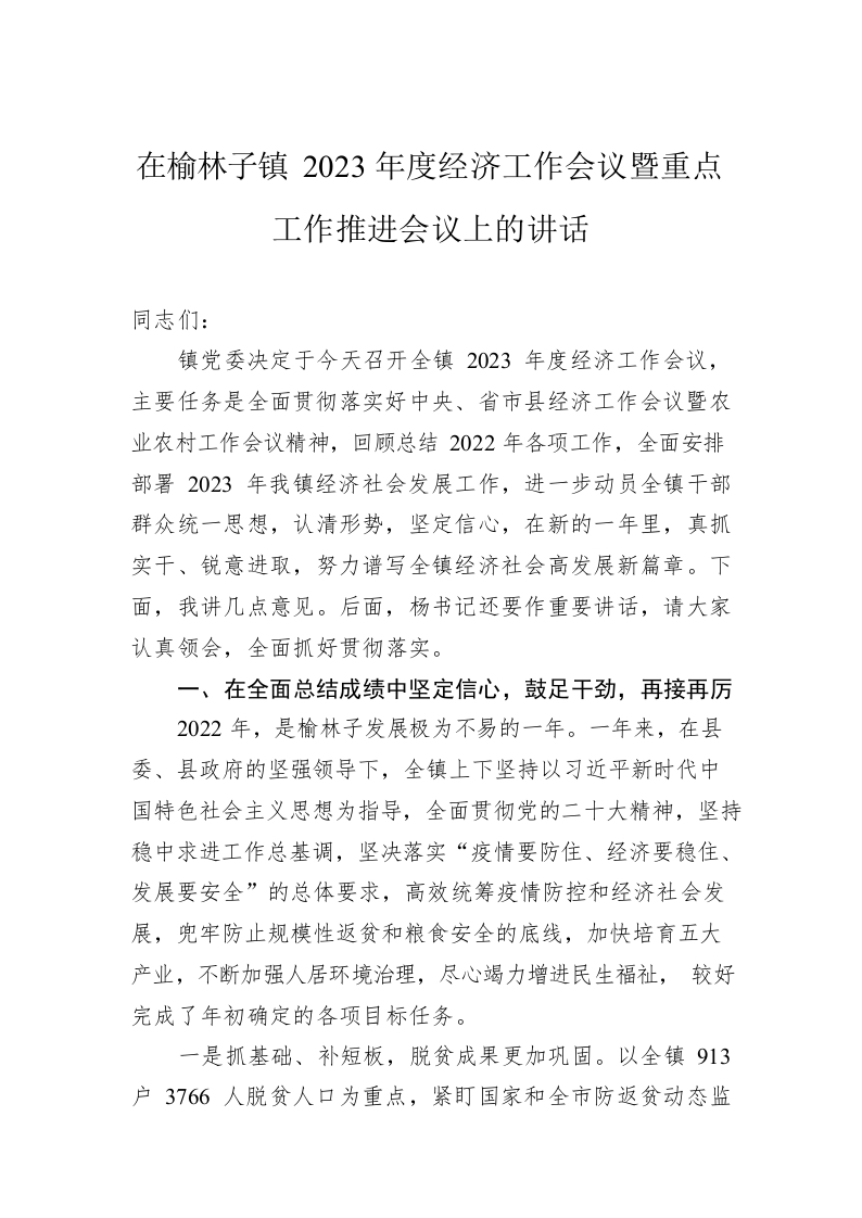 在榆林子镇2023年度经济工作会议暨重点工作推进会议上的讲话(20230224)