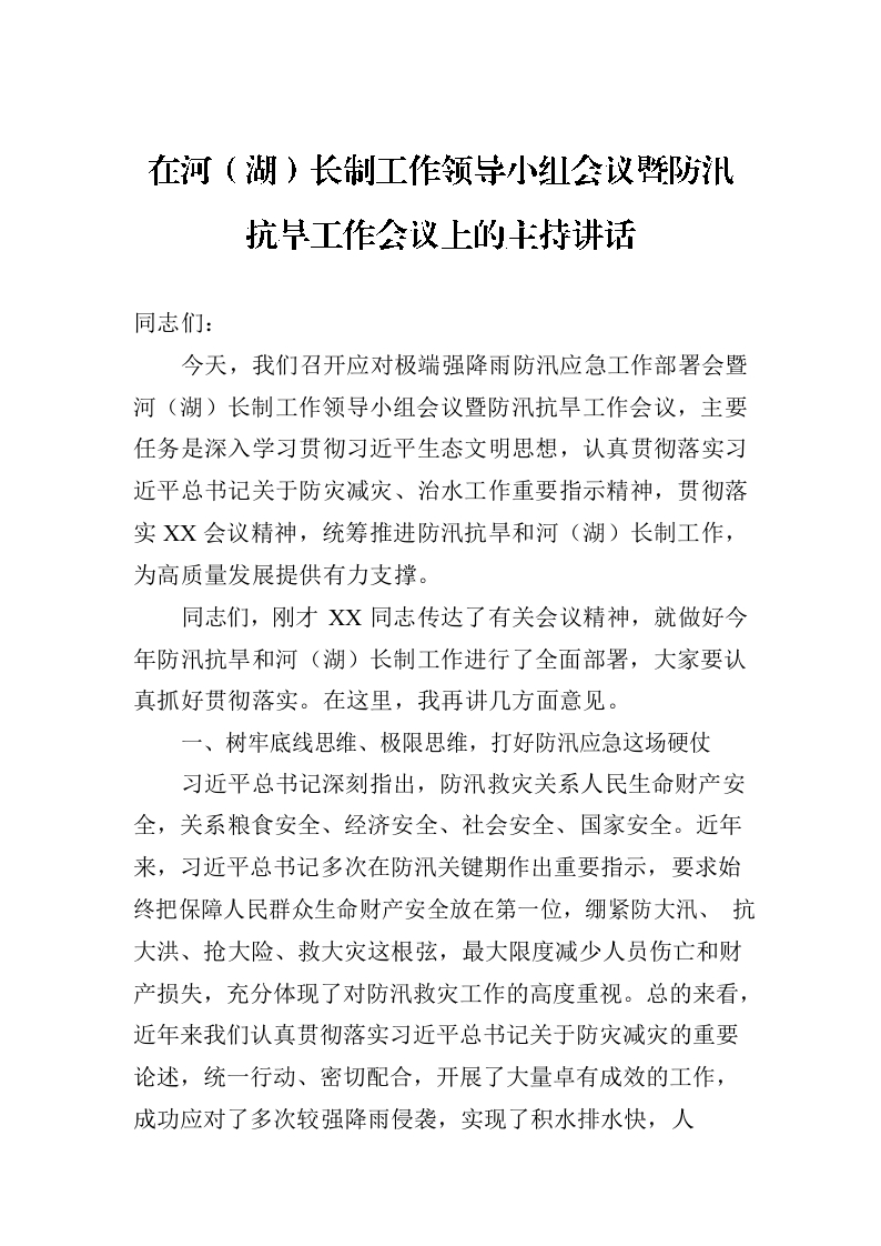 / 在河(湖)长制工作领导小组会议暨防汛抗旱工作会议上的主持讲话
