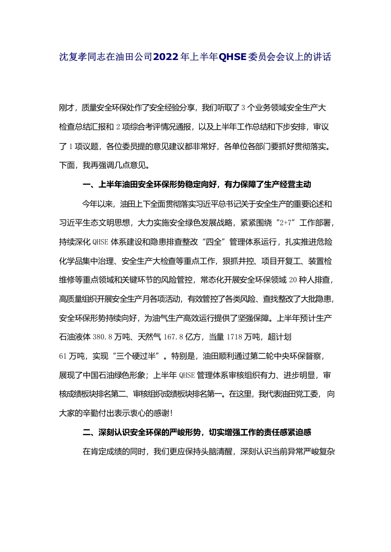 在油田公司2022年上半年QHSE委员会会议上的讲话
