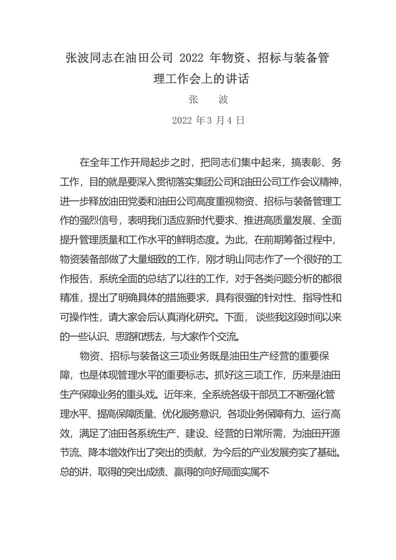 / 在油田公司2022年物资、招标与装备管理工作会上的讲话
