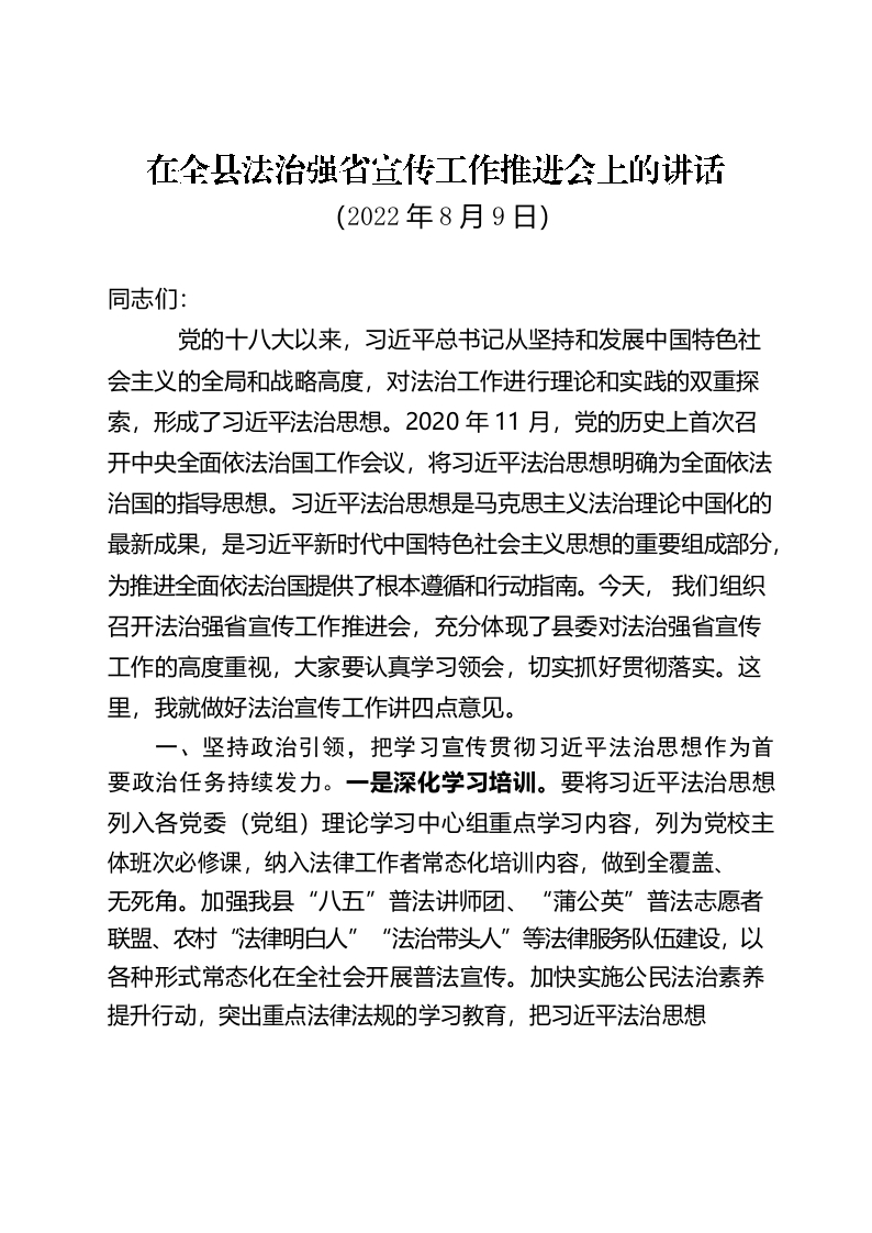 / 在法治强县宣传工作动员部署会上的讲话(20220803)