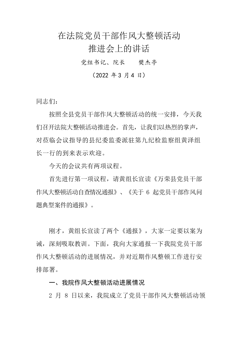 / 在法院党员干部作风大整顿活动推进会上的讲话
