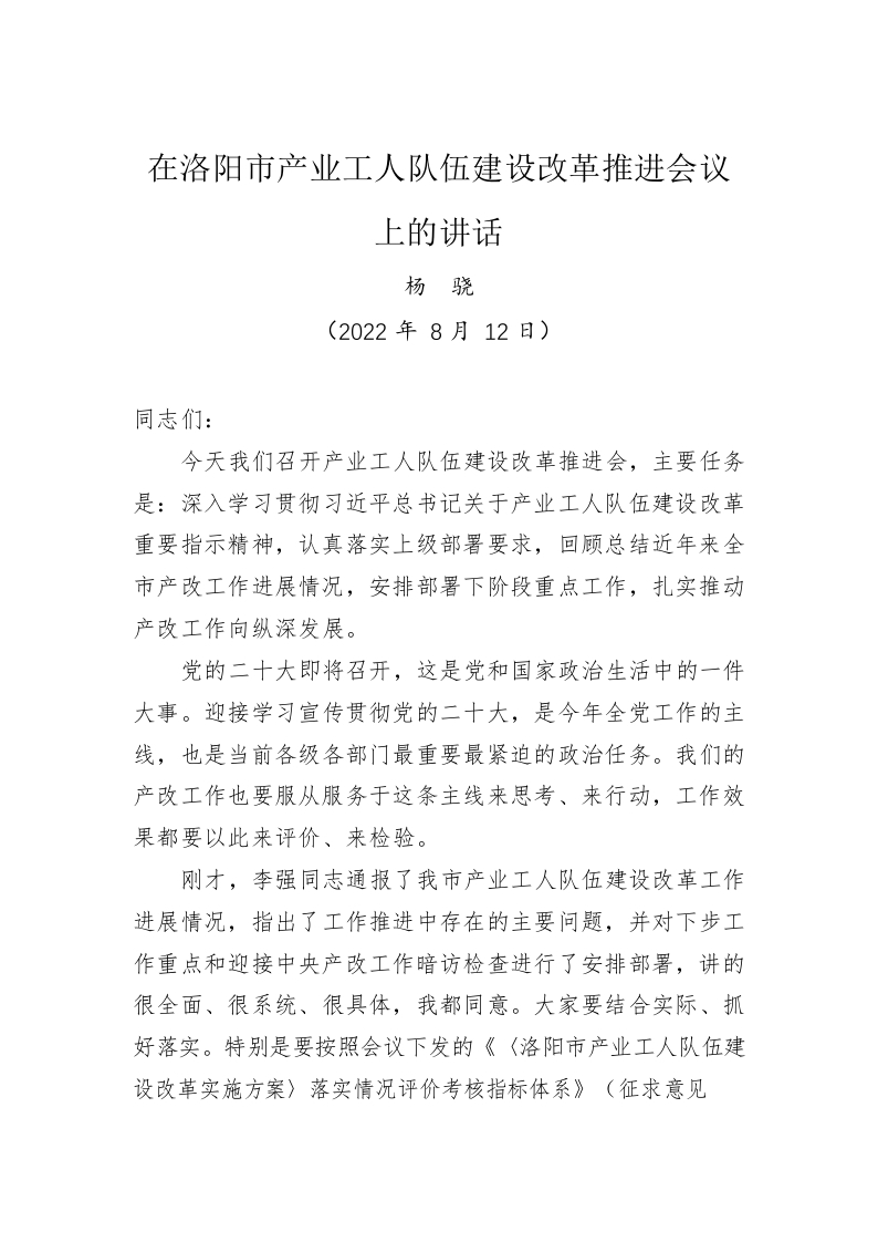 / 在洛阳市产业工人队伍建设改革推进会议上的讲话(20220812)