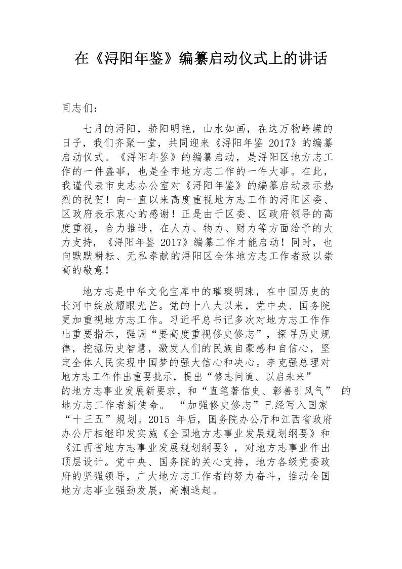 在浔阳年鉴启动仪式上的讲话